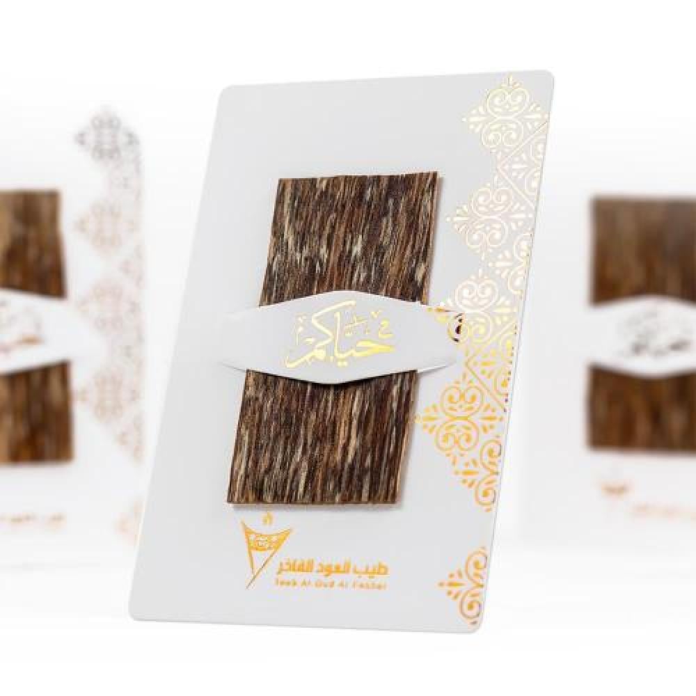 توزيعات حياكم بالعود الطبيعي مصممة لتضيف لمسة راقية لمناسباتك، كل كرت يحتوي على رقائق العود الفيتنامي الطبيعي برائحة فاخرة تدوم، وهي مناسبة للتقديم في الأعراس والمناسبات الخاصة، خصوصًا مع تصميم الأنيق الذي يليق بضيوفك.