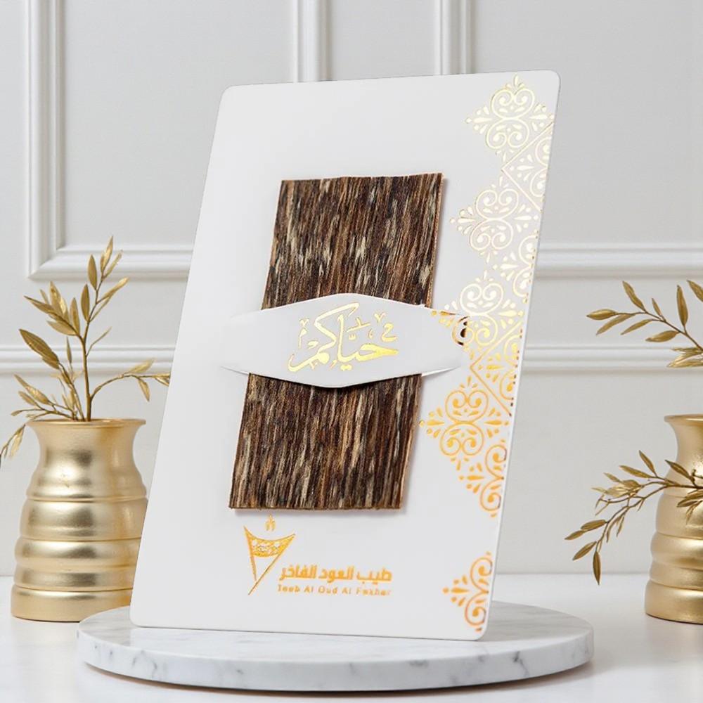 تقدّم توزيعات عود – كرت حياكم أسلوب ترحيب أنيق يعبّر عن الكرم والذوق الرفيع، لتكون من أجمل توزيعات الضيافة للمناسبات في السعودية. يحتوي كل كرت ترحيبي مطبوع عليه عبارة «حياكم» على رقائق عود فيتنامي طبيعي برائحة فاخرة وثبات ملحوظ، لتشكّل لمسة ضيافة راقية تليق بالأعراس والمناسبات الخاصة والاستقبالات.