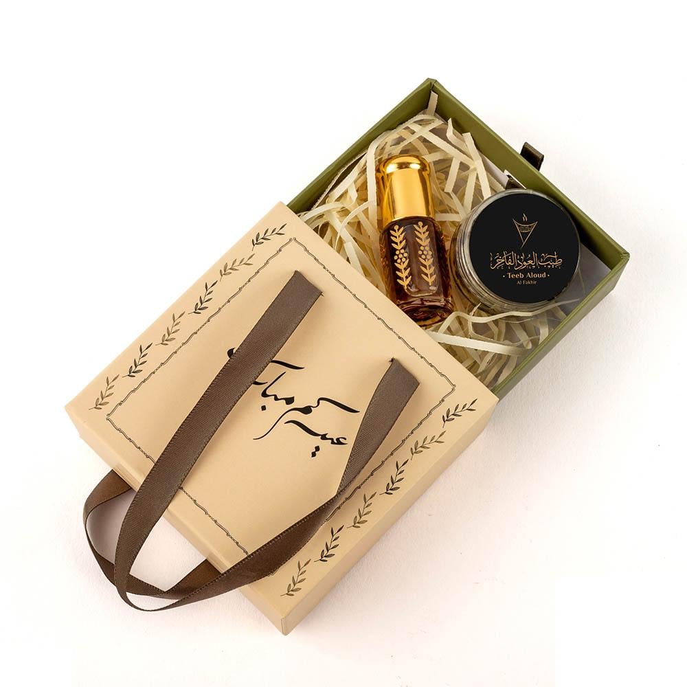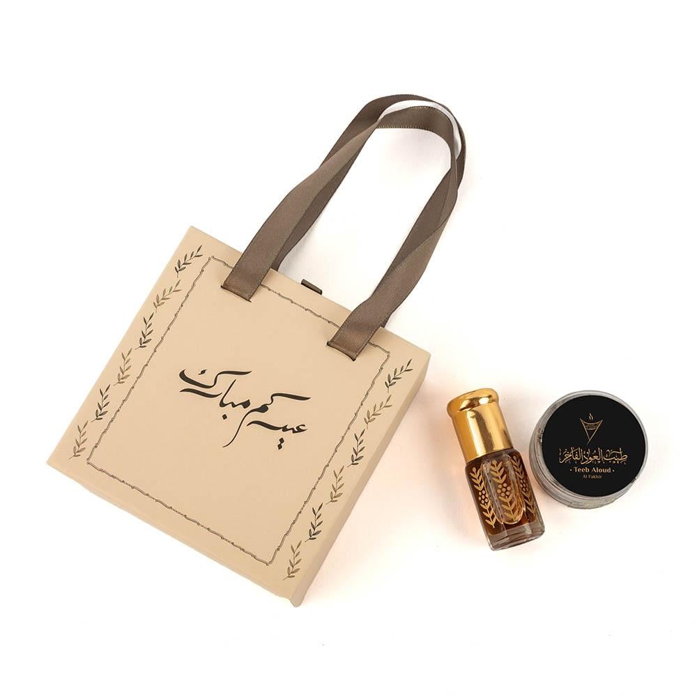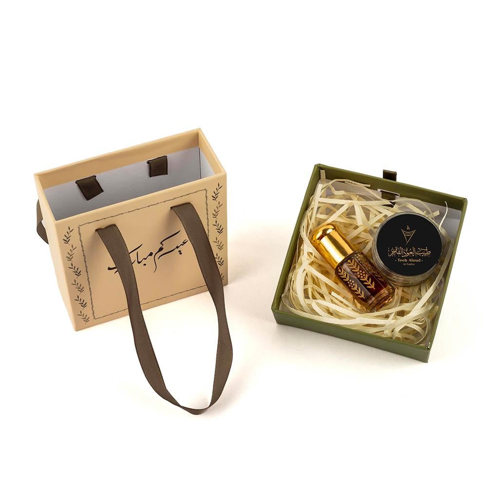 توزيعات العيد عود ومسك العود الفاخر A تأتي داخل كيس مربع بيج مزخرف بزخارف نباتية راقية وعبارة “عيدكم مبارك” بخط ذهبي فاخر، وتحتوي على ربع تولة من مسك العود الفاخر مع كسرات عود معطر داخل علبة داخلية أنيقة تحفظ المكونات وتُبرز فخامة التقديم.